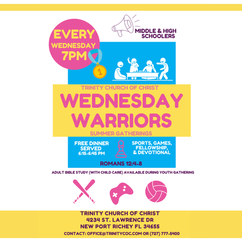 During Summer 2023, gather with other Middle and High Schoolers for food, fun, and faith each Wednesday night. Dinner will be served each week at 6:15 PM followed by Bible lessons, games, and great fellowship.